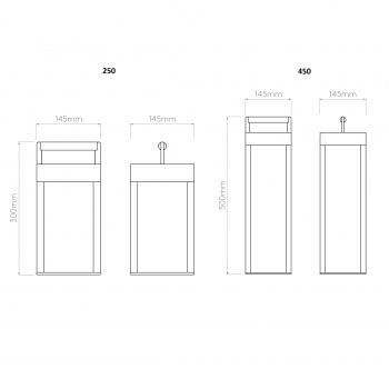 | Dimensions: | 250: Width: 14.5cm Height: 30cm Depth: 14.5cm 450: Width: 14.5cm Height: 50cm Depth: 14.5cm |