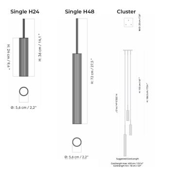 Dimensions: | Single H24: Shade: Ø5.6cm Shade Height: 24cm Single H48: Shade: Ø5.6cm Shade Height: 48cm Cluster: Shade: Ø5.6cm Shade Height: 48cm Cluster/Canopy: 20cm² Cable Length (Adjustable): 10-400cm |