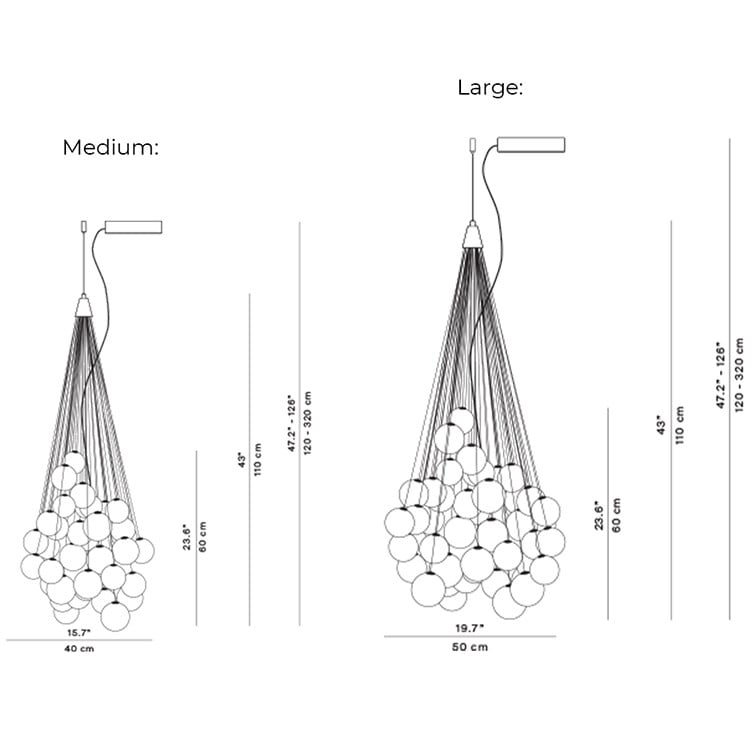 | Dimensions: | Medium: Ø40cm Height: 60cm Large: Ø50cm Height: 60cm Min Drop Height: 120cm Max Drop Height: 320cm Ceiling Rose: 18cm x 14cm |