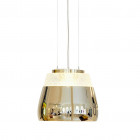 | Materials: | Crystal clear blown glass Black, chromed or gold plated shade Transparent cord 3 steel cables Matching steel cylinder canopy |